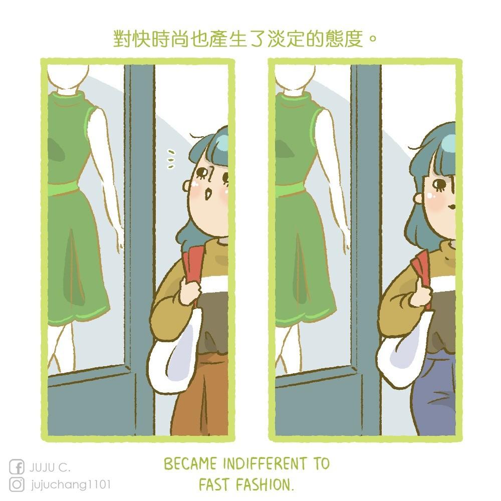 後來注重環保是耳濡目染的。在英國身邊大多的朋友是想法前衛的藝術學生;復古和二手時尚、veganism(純素主義) 是當時常見的話題。我逐漸覺得很多東西不用走在時代尖端;並不是新一季的衣服就要穿到,有話題的餐廳就一定要吃到,或漂亮的東西就一定要買回家。在深入了解這些興起的風潮時,我才恍然大悟這個世界不是表面上那麼完美。先進和方便的背後有許多需要我們維護的人和動植物的生命。生活態度不知不覺在社會前進中倒退了。