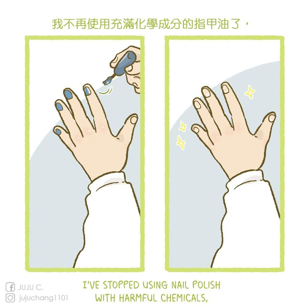 小時候我曾經對指甲彩繪充滿熱愛,甚至拿我把拔男人味很濃厚的手指當model。上了高中我還是那個喜歡擦黑色指甲油展示rocker精神的假叛逆少女。自從習慣在買東西時看清楚成分標示,我開始納悶為什麼要把這些化學物品塗抹在身上,把參雜了防腐劑和色素的食物吃下肚裡?於是我戒掉了擦指甲油的習慣,櫥櫃裡也少了去光水和棉花。算一算,到今天已經有3、4年的時間沒有常態性擦指甲油了。