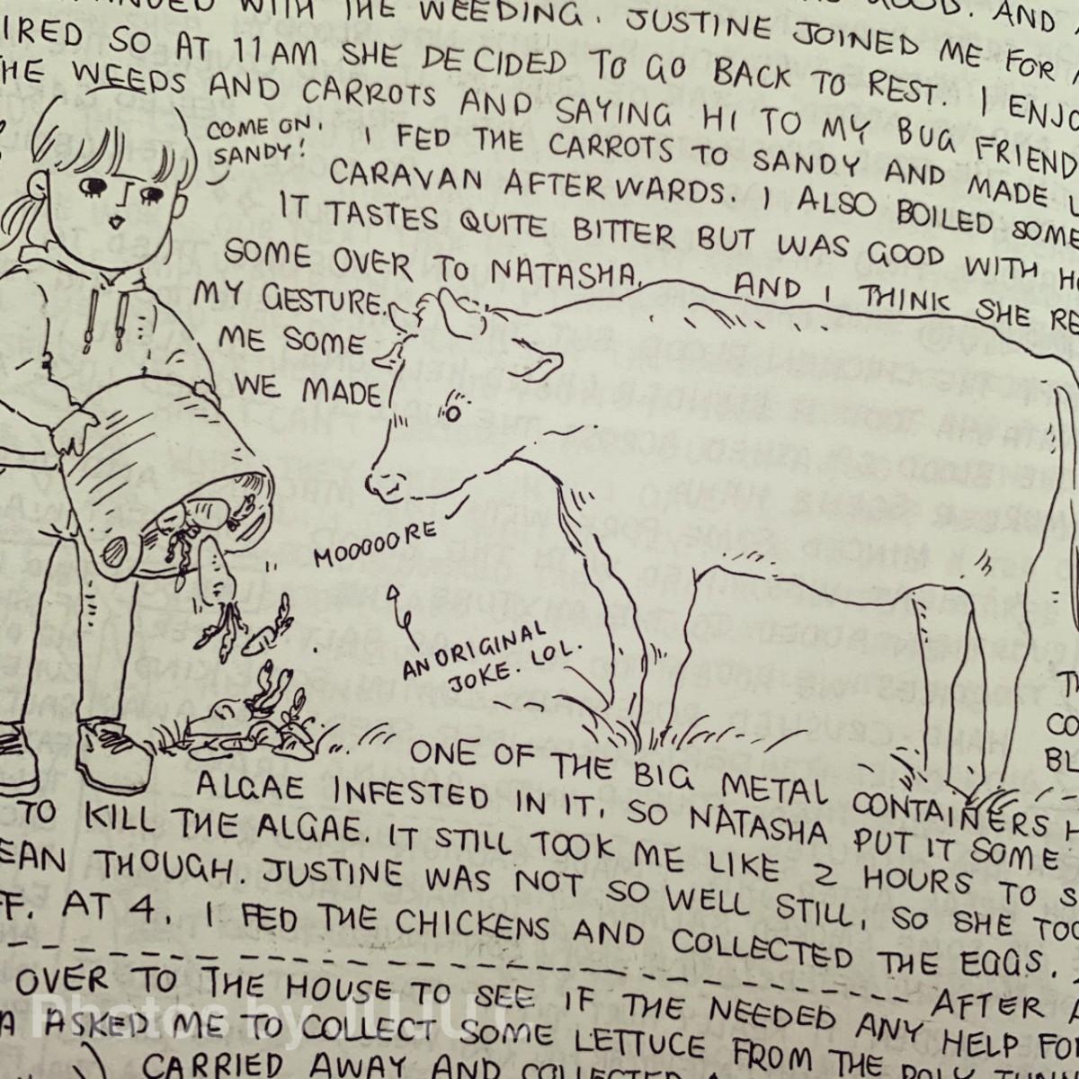 很多人一來到農場就是遠離塵囂好幾個月,但畢竟我是第一次體驗,決定先從保守的一個禮拜開始。我和一位已經在這裡打工一個月的法國女孩同住在一輛陳舊的露營車中,從窗戶就可以看到公牛Sandy在草坪上散步。