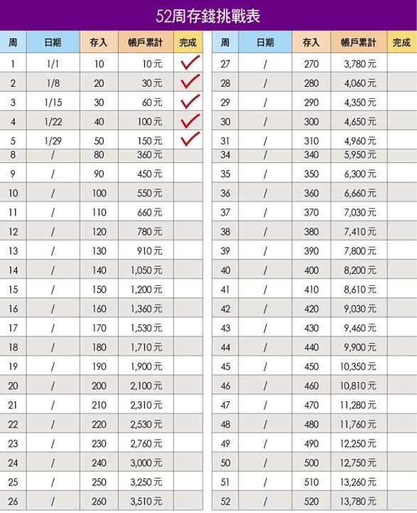 這個蠻有趣的,主要規則就是要一週存的比一週多,如果以十元為單位,那麼第一週存10元,第二週就存20,以此類推,也可以自己將數字往上加。