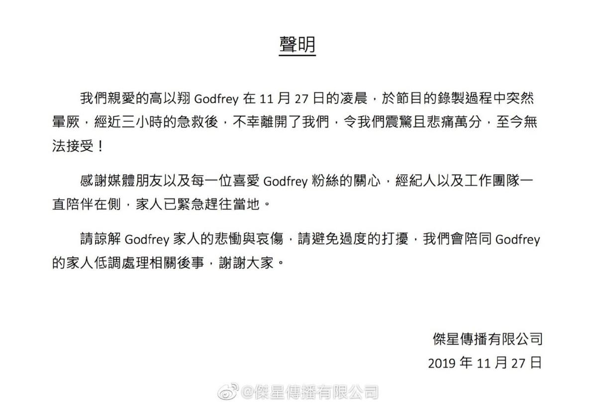 有微博網友還原現場狀況,高以翔在昏迷之後,現場一度混亂,只聽到有人大喊:「有沒有心跳?」情況相當危急,而救護車到場後也立刻將高以翔送到醫院搶救,而經紀公司也發表聲明證實(圖二),高以翔在搶救之後還是宣告不治,家人也已經趕往當地處理相關事宜。