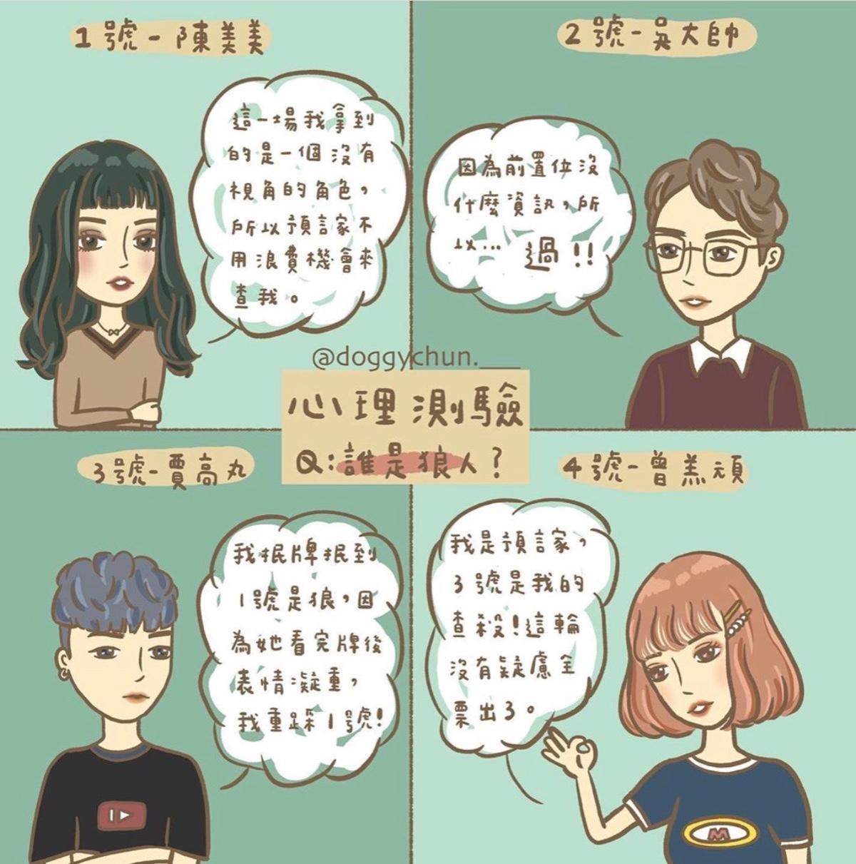 想必不少人都有看過狼人殺🐺🔪 每次看的時候都在想, 抽到狼人的話要怎麼表水呢? 對於我這種不擅長說謊的人來說真的是太痛苦了 一定一發言就心虛🤣 那麼以上四位玩家, 各位覺得誰的發言或肢體動作最像狼呢? 測驗你的個性及擅長的領域唷~ (解析在第二張😇) 如果有準的話歡迎留言分享 如果不準也歡迎留言讓我進步~ 喜歡歡迎到ig看看:doggychun.___