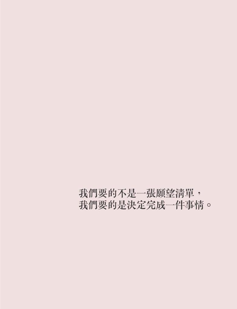「我們要的不是一張願望清單,我們要的是決定完成一件事情。當你決心要達成的時候,你要排除一切的可能、你要破釜沉舟、你要專注在結果,排除困難使命必達。大部分人寫下願望只是期待它自然地發生。如果沒達成呢?他們不會太失望,因為他們其實沒有投入太多的行動。」
