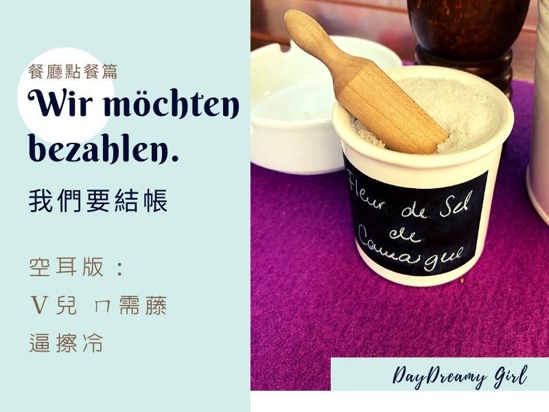 註:德國餐廳不像台灣部分餐廳有規定用餐時間,頂多你盤子、杯子空了,服務生會過來問一下Alles gut?(一切都好嗎?) 如果你與朋友一起用餐,當你準備要結帳了,可以說Wir möchten bezahlen.來告訴服務生你要結帳,服務生則會問你Zusammen oder getrennt? (組渣門 歐德 格疼特?)zusammen是一起、getrennt是分開。