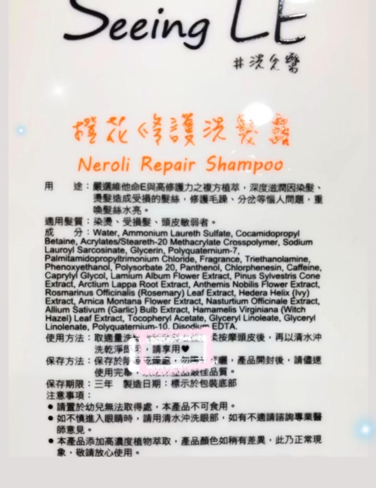 🌟橙花修護:主打添加維他命E:具保濕、滋養及調理呵護秀髮不受到強烈日照傷害。適用髮質:染燙、受損髮、頭皮敏弱者。這罐味道是淡淡的花香,我剛好最近壓力大有去抓頭皮,有些小傷口,用的時候不會像我用其他會有刺痛的感覺,「還是有一點不適」但不適的感覺比較低。