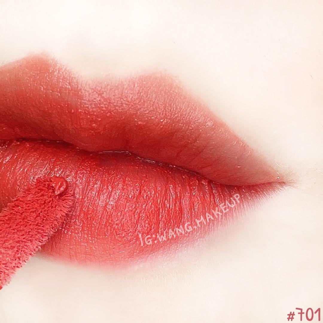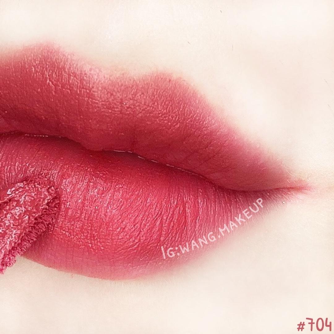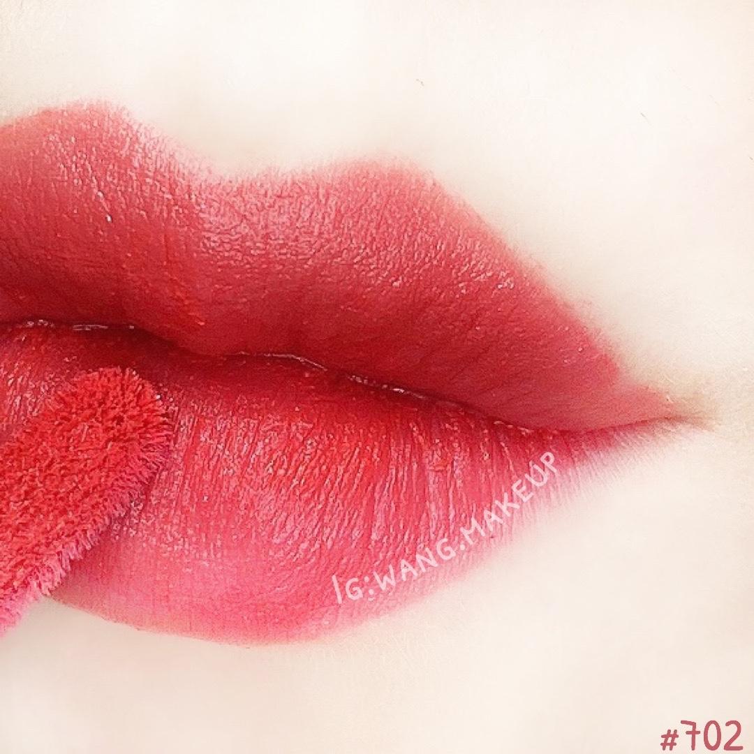#702 鬱金香紅:可愛感十足的桃紅色,但我覺得它可能有點挑膚色,白肌顯白、上唇可愛感upup,但健康肌建議去實擦看看唷,帶有桃色調的唇彩會比其他色調再更挑膚色🏼