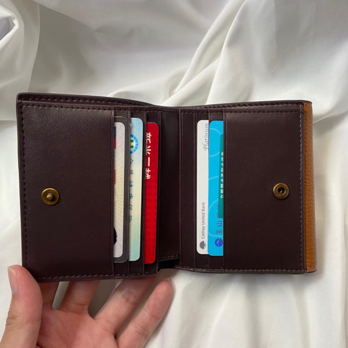 他的正面是用偏黃的棕色加上黑色跟米白色皮革製成,仿舊的大C扣環就是零錢格,我覺得有沒有零錢格算是我會優先考量的;後方是卡夾與鈔票夾的夾層,卡夾一共可以放8張卡,算是蠻能放的小短夾,而鈔票夾放千鈔會蠻剛好的,所以可能不適合放太多鈔票,百鈔跟五百鈔票都是輕鬆放入沒問題~而在正面大C打開後,其實還能夠放一張常用的卡片,我個人是放悠遊卡在前面,這樣打開抽取就不用喵悠遊卡是哪一張ㄌ,算是蠻貼心的設計⠀