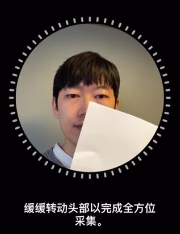 👉🏻接著打開手機設定face ID的頁面,再將A4白紙「斜45度角」擋住臉部下方右半部(如圖二),接著開始臉部掃描,此時A4紙固定不動,只有頭動。