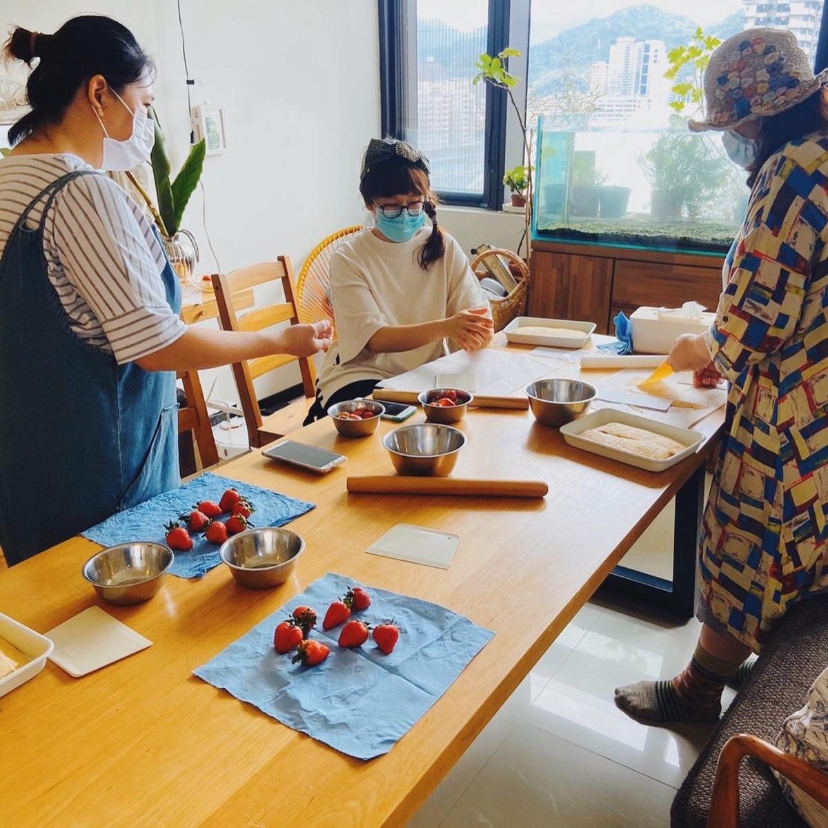 因為除了揉麵糰和裁切麵皮需要自己動手外,打發鮮奶油和進烤箱,全都不需自己動手,在等待麵皮烤好,要做最後的堆疊麵皮和裝飾前,老師會在等待的時間招待大家精緻的下午茶點