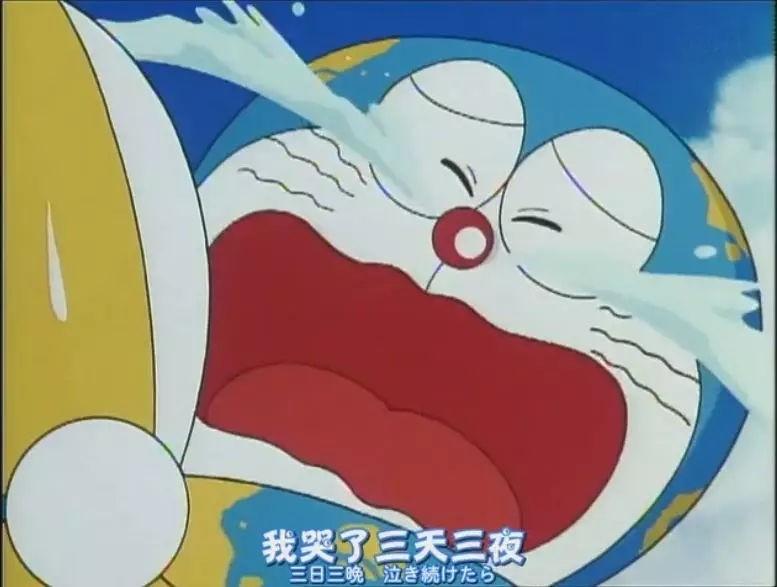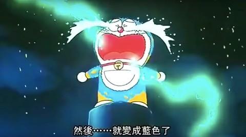 (圖4、5、6、7)1995 後:哆啦A夢想喝「元氣口服液」來增加自己的自信,結果卻誤喝到「悲劇口服液」,所以又哭到身體從黃色變成了藍色。