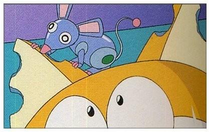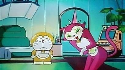 (圖2)1985 前:哆啦A夢從鏡子中看到自己的耳朵被老鼠咬掉,受到刺激後從黃色(跟妹妹哆啦美的顏色一樣)轉變成藍色。