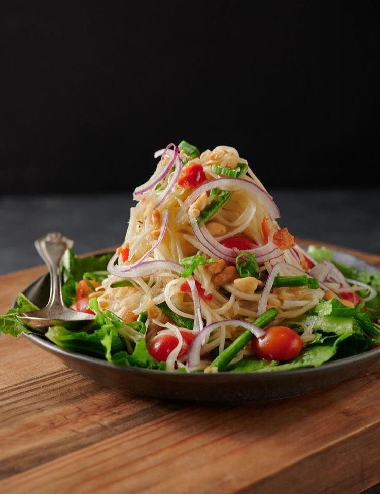 具備了酸、甜、鹹、辣的多層次口味,是最經典的泰國沙拉。音譯「宋丹」,源於寮國和泰國東北的伊善地區(曾屬於寮國的前身─南掌王國);一直到 19 世紀,它才隨著依善地區大量移工的腳步遍及全國。涼拌青木瓜本來以辣味為主,通常會加入醃螃蟹、醃魚、蝦米和羅望子,一直到曼谷才因為中部喜甜的關係加入棕櫚糖,成就了今日豐富的層次。泰國詩琳通公主曾在15歲時寫作《涼拌青木瓜之歌》,歌詞是其製作方法。