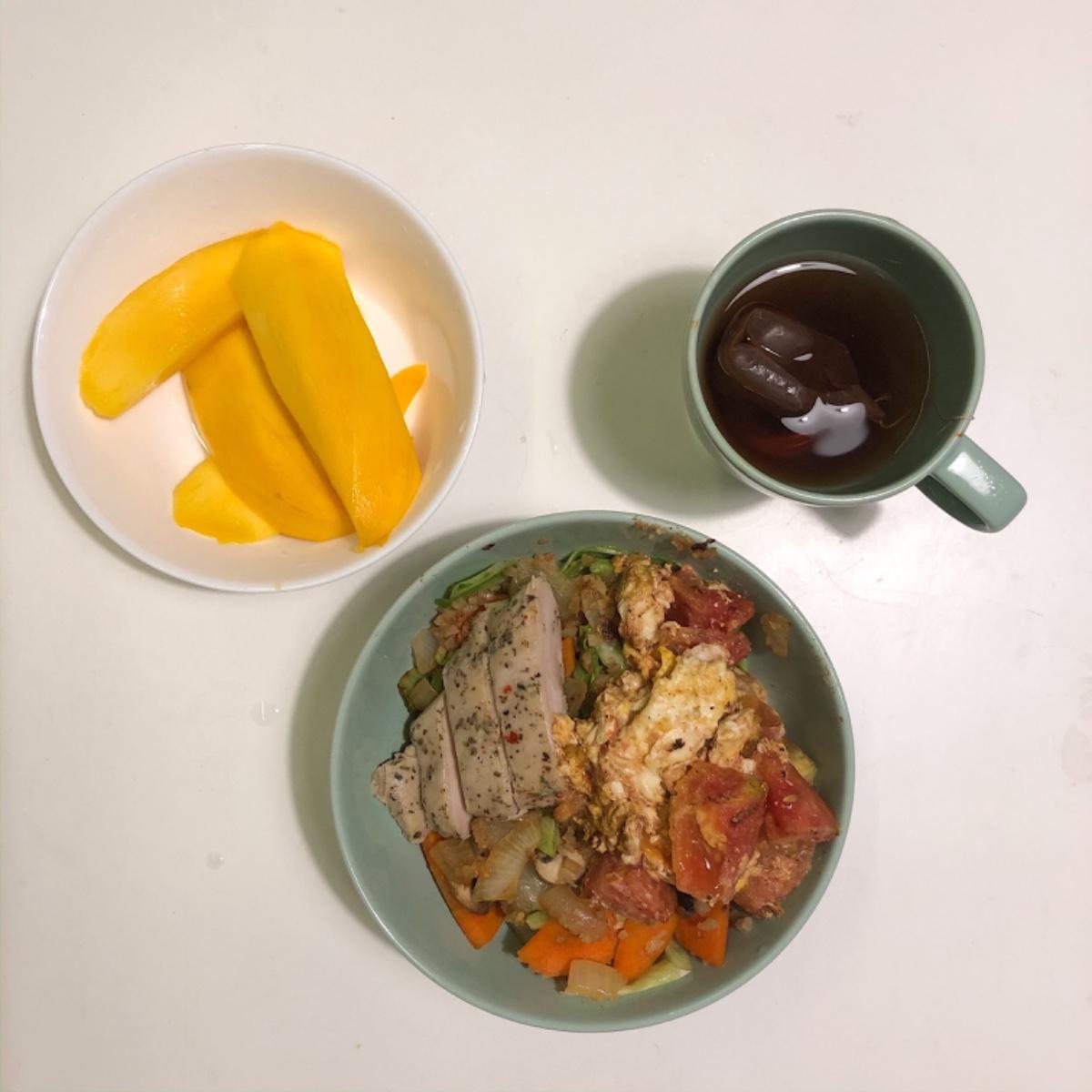 晚餐 - 沙茶炒菜 + 雞胸+ 芒果 + 紅茶