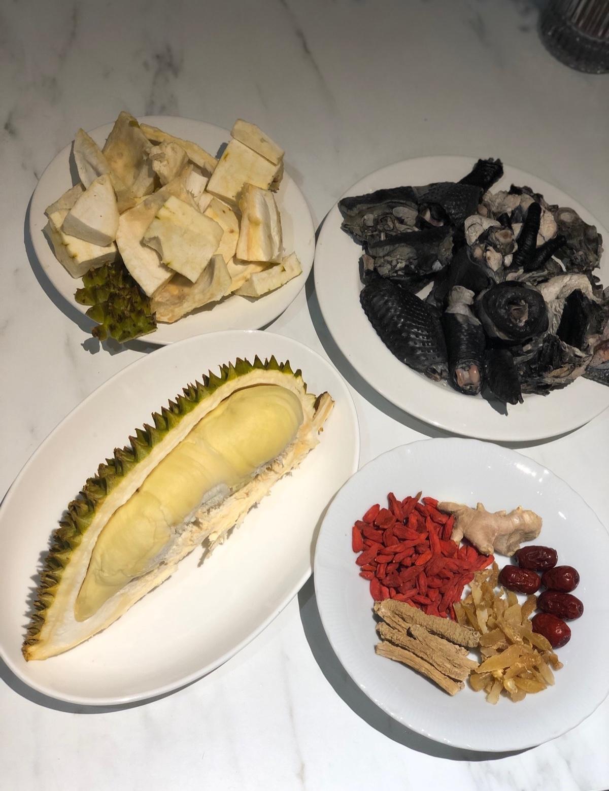 取榴蓮的白囊燉半隻烏骨雞,尖尖的刺不要哦,只取其白囊。