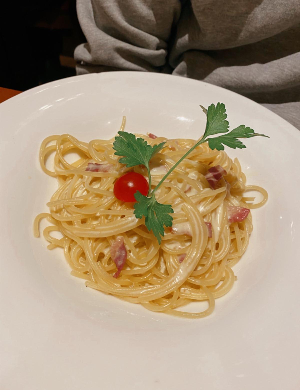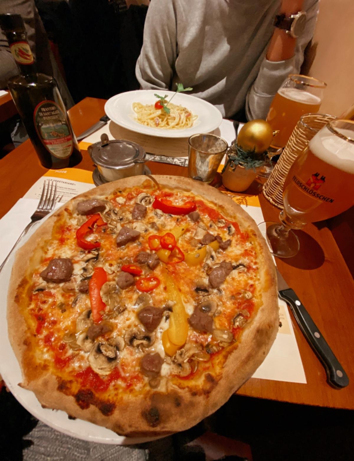 餐廳主打意式pizza, 提供一系列以不同材料組合製成的pizza 和意大利面。我們點了一份牛肉蘑菇雜辣椒批和卡邦尼意粉, 巨大的 pizza 起碼佔了半個桌子以上,錎料豐盛,意粉超級美味,稠杰的醬汁均勻地掛在每一根面條上,入口滿是濃郁的蛋黃香。巨批、意粉、瑞啤,再來甜品,食完這一頓明天的早餐基本可以省掉了。