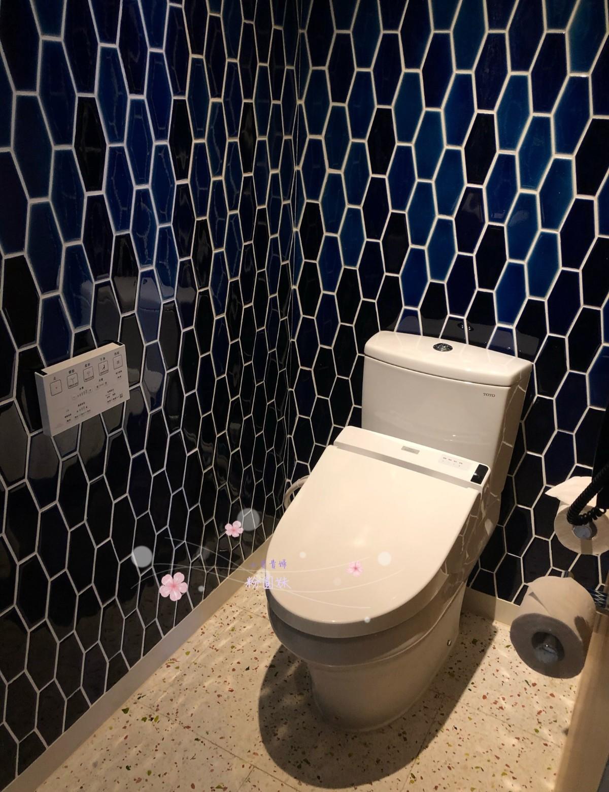 浴室跟廁所藍色馬賽克磁磚運用不同等級的藍色做搭配,