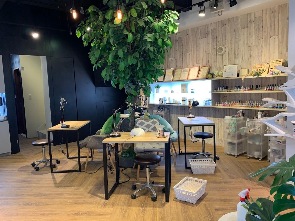 周圍附近有停車格,開車或搭乘大眾運輸工具都很方便,藍底白字簡潔有設計感的招牌非常時尚、醒目,一推開門後,因為疫情關係一樣有簡單的量體溫消毒作業,撲鼻來的是淡淡的花香,室內以木質調為主的設計,綠意盎然的療癒植物,宛如身於山中,優雅放鬆,很喜歡這個氛圍,一瞬間緊張不安感都消失了