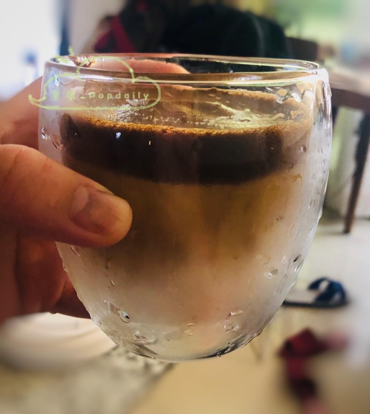 最後倒入牛奶跟冰塊,再鋪上超完美的手拌咖啡奶蓋