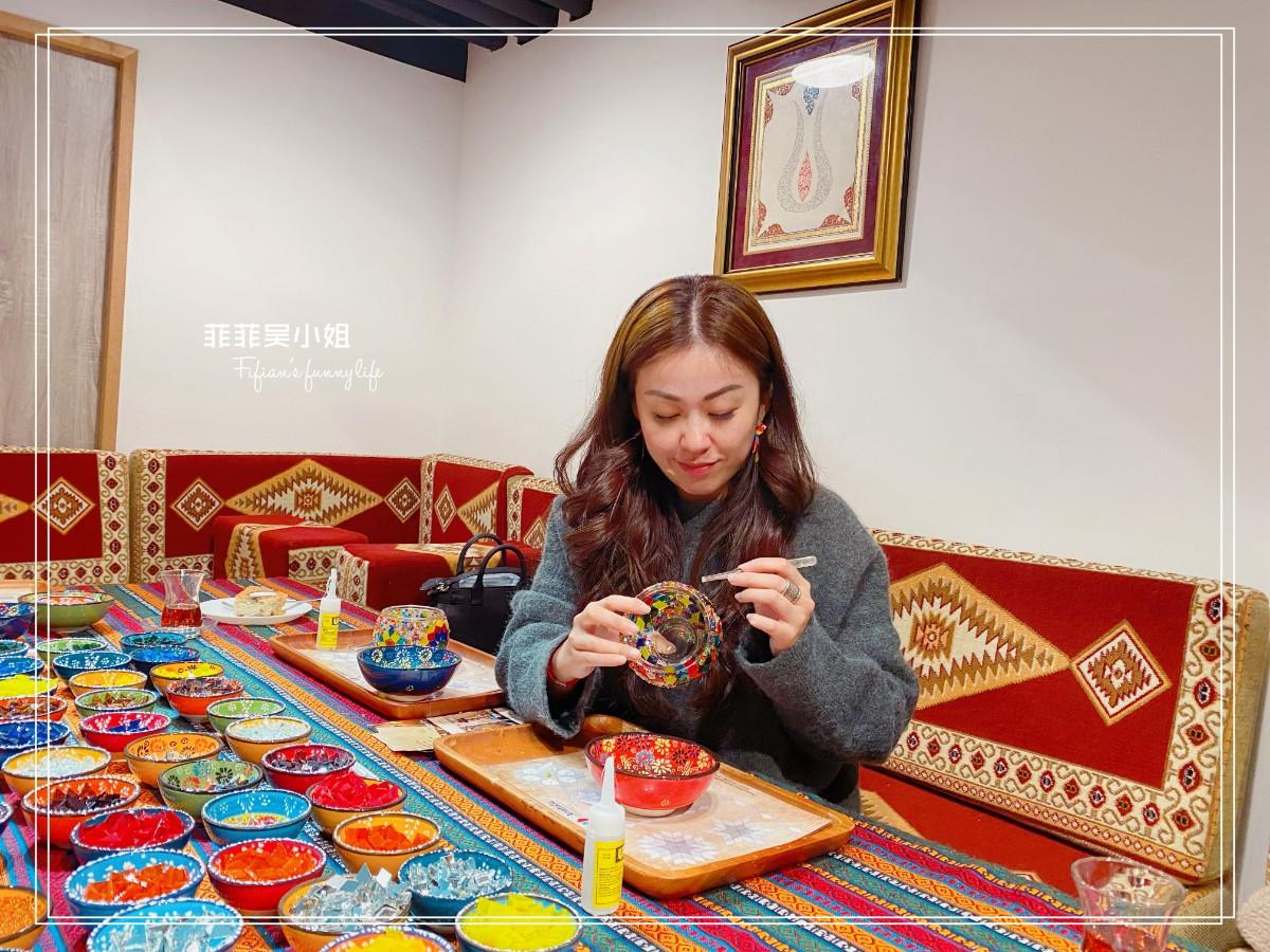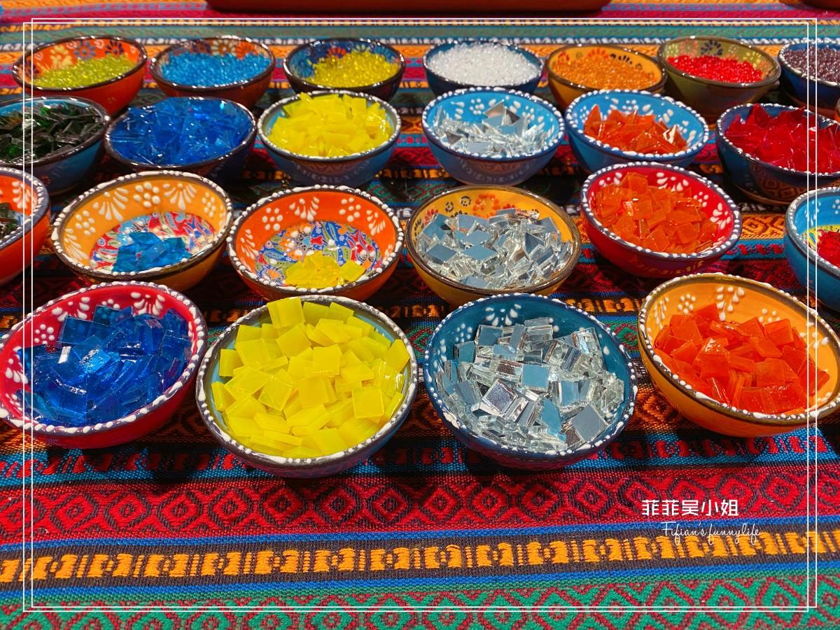 桌上擺放了數十種手工切割的水晶馬賽克玻璃及各式各樣的小玻璃珠,就連盛裝水晶馬賽克玻璃的小碟子也好漂亮,色彩鮮豔是土耳其特有的手工彩繪陶瓷碟子!