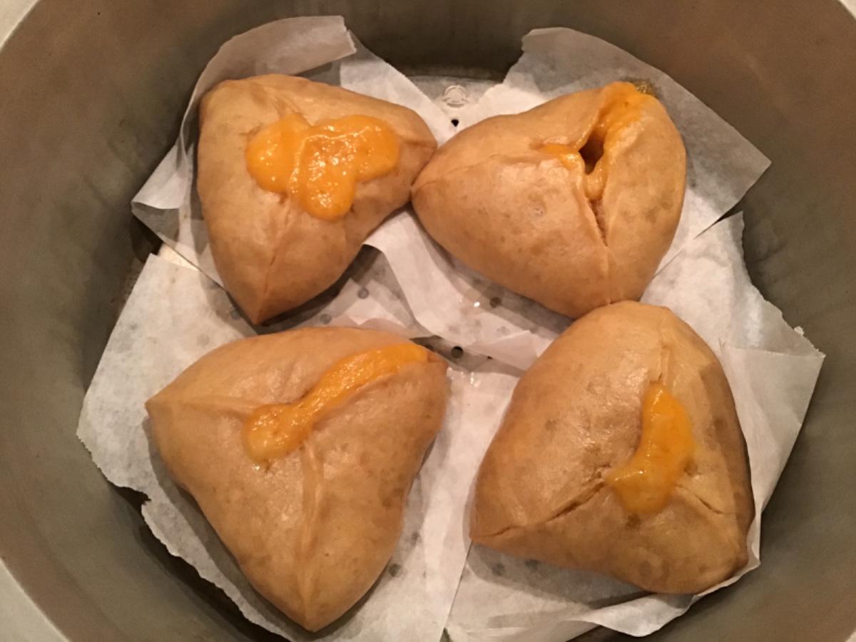 愛上麵糰幾天了,做過基本款牛奶饅頭、烤饅頭,嘗試了花俏的蔥花捲,接著往包子前進,挑戰爆漿起司包。同時嘗試了黑糖牛奶麵皮,捏成花俏的三角形。這好像是水晶餃的包法,做起來比傳統包子折一整圈要簡單得多,捏一捏就完成了。