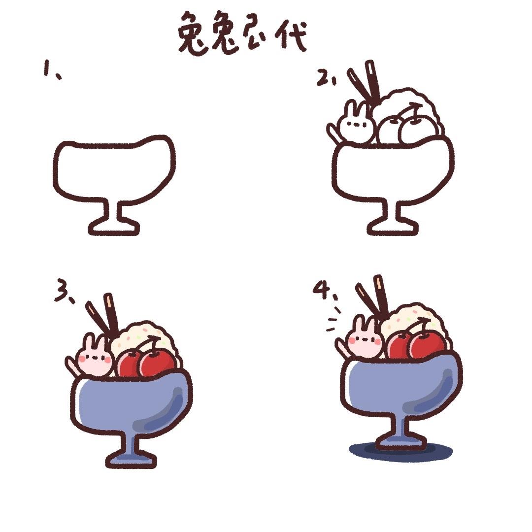 首先畫一個碗,接著畫上甜甜的配料!然後上色,再加上一些小細節!可以跟著自己的喜好替換動物或是上面的配料喔~最喜歡酸酸甜甜的草莓了🍓
