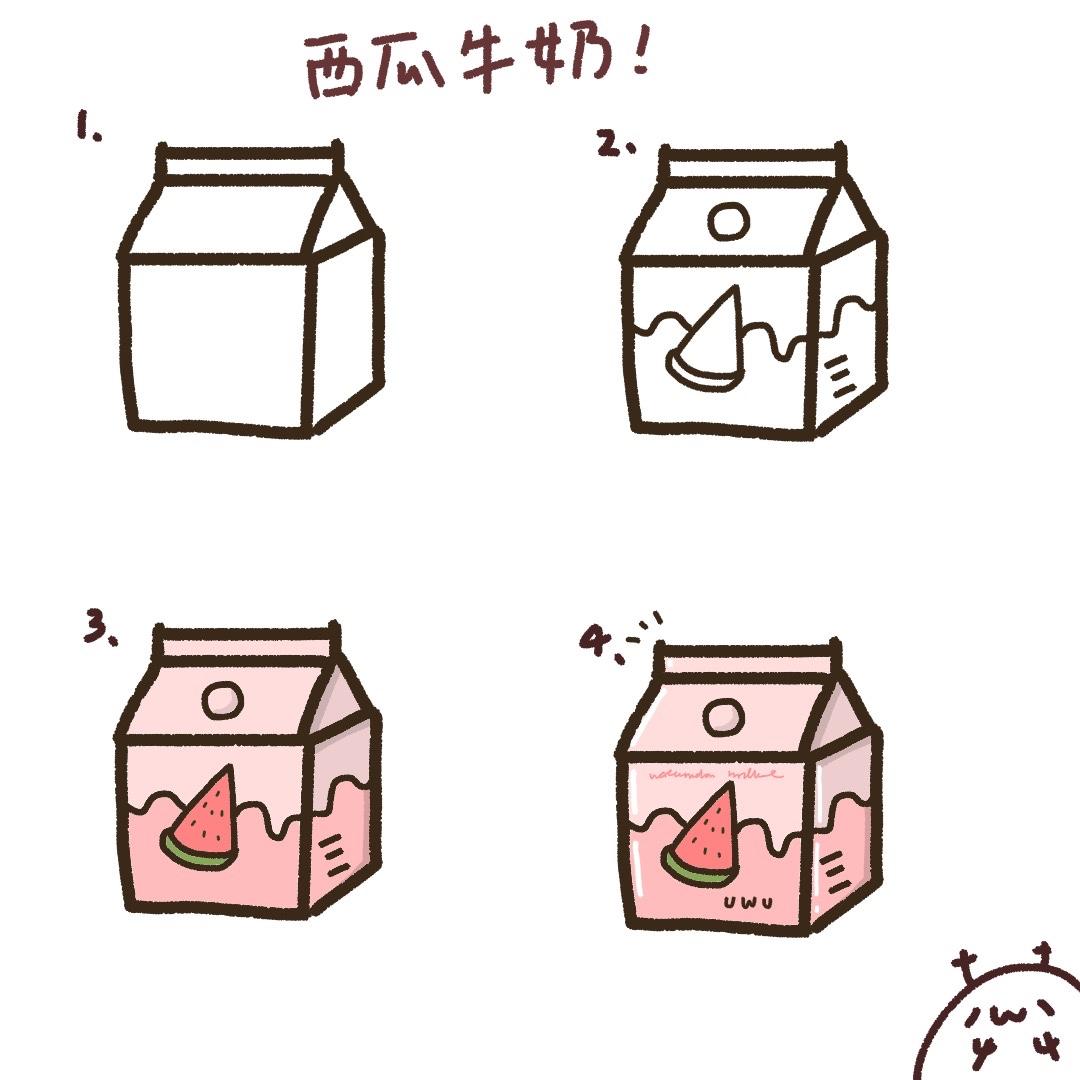 先畫出牛奶盒,然後再牛奶盒面上畫上水果和條碼,跟一些簡單的線條,接著上色,搭配水果幫牛奶畫上不同顏色,幫他加上反光!就完成了~