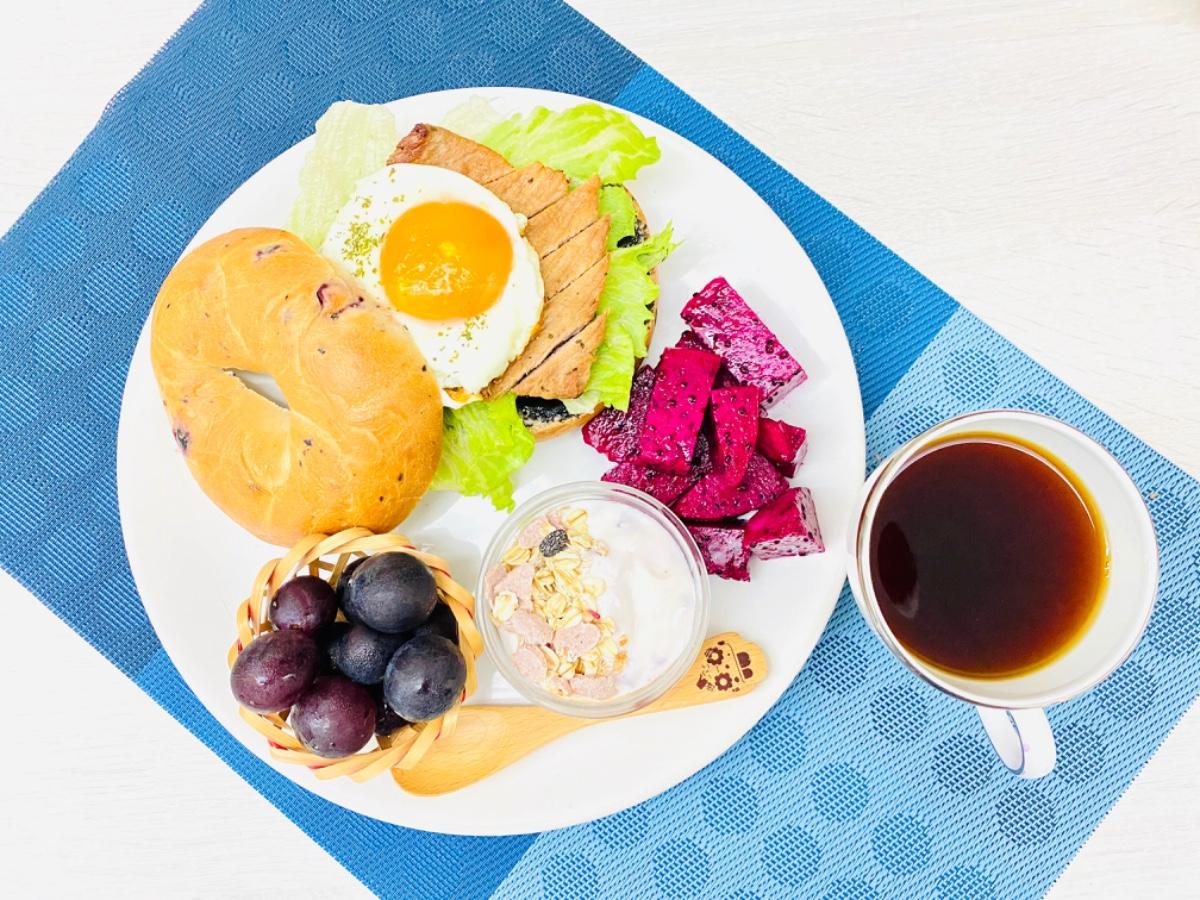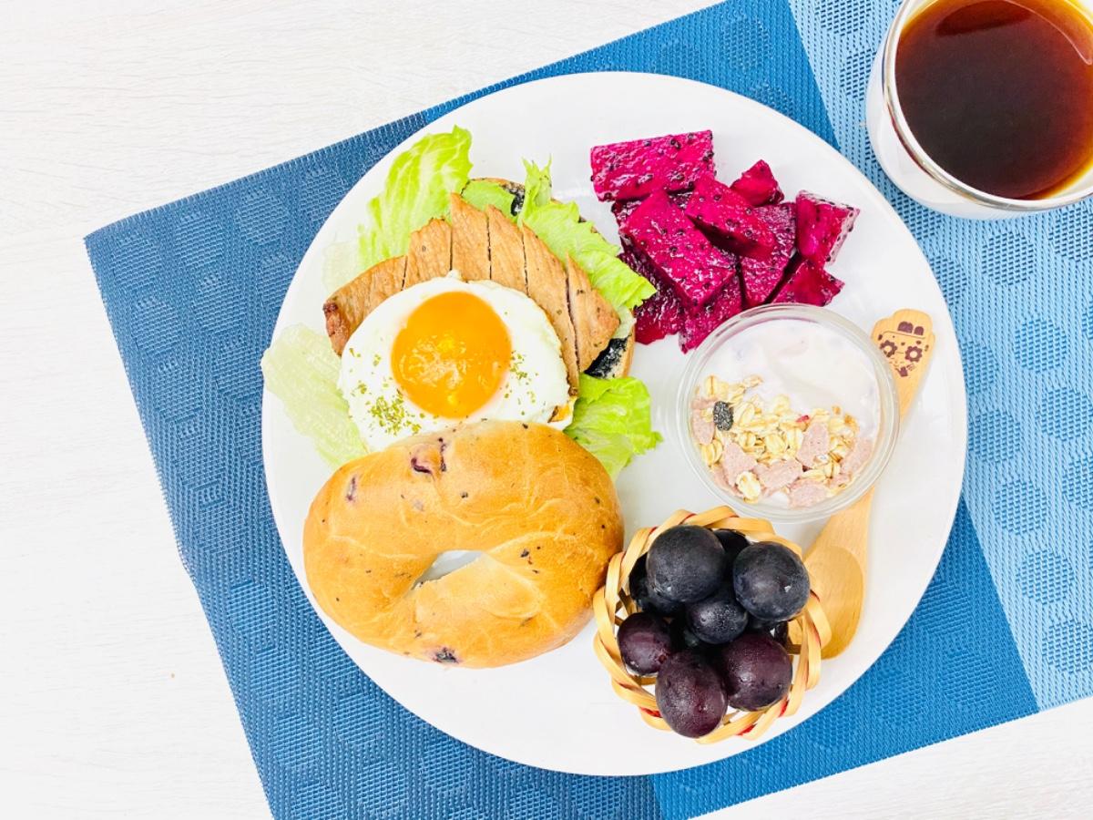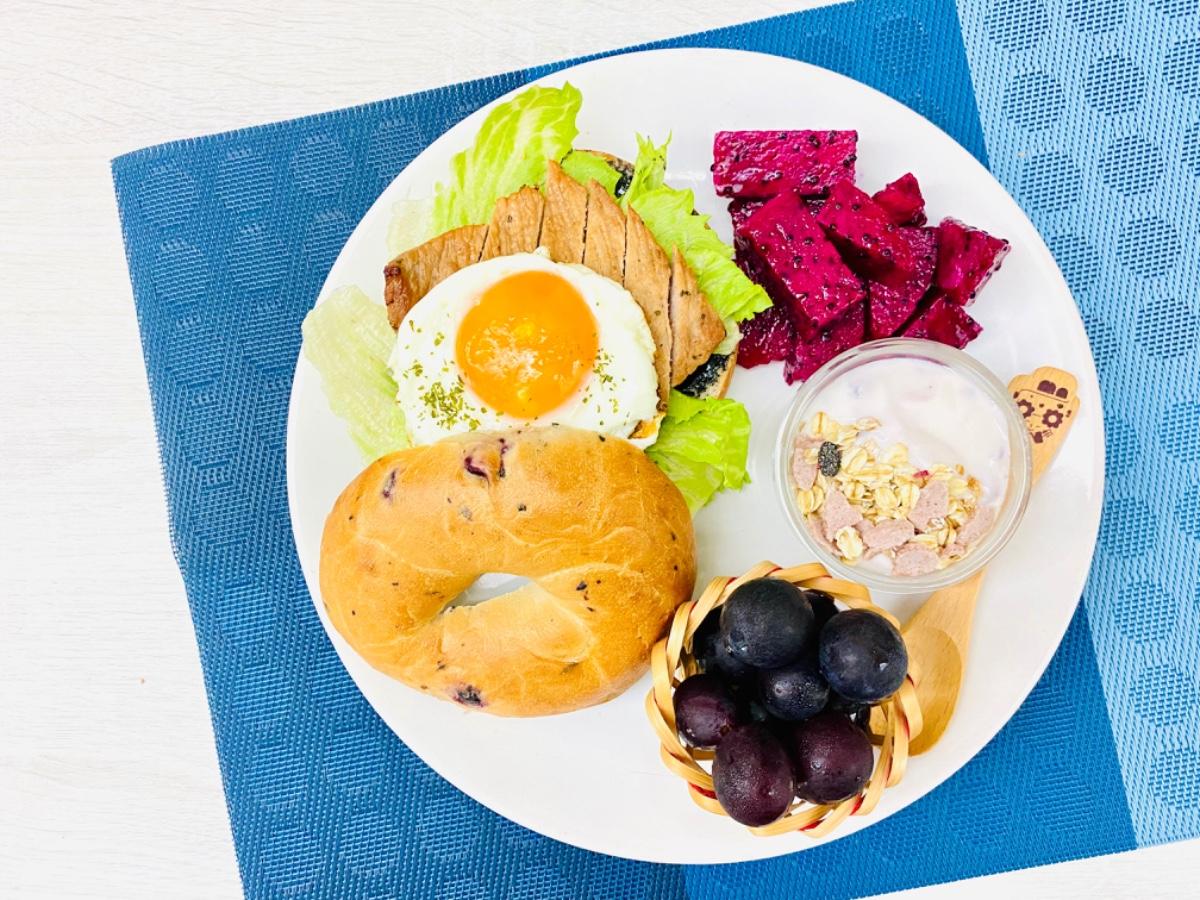 主食:烤蘿勒豬肉排太陽蛋生菜🥬藍莓貝果