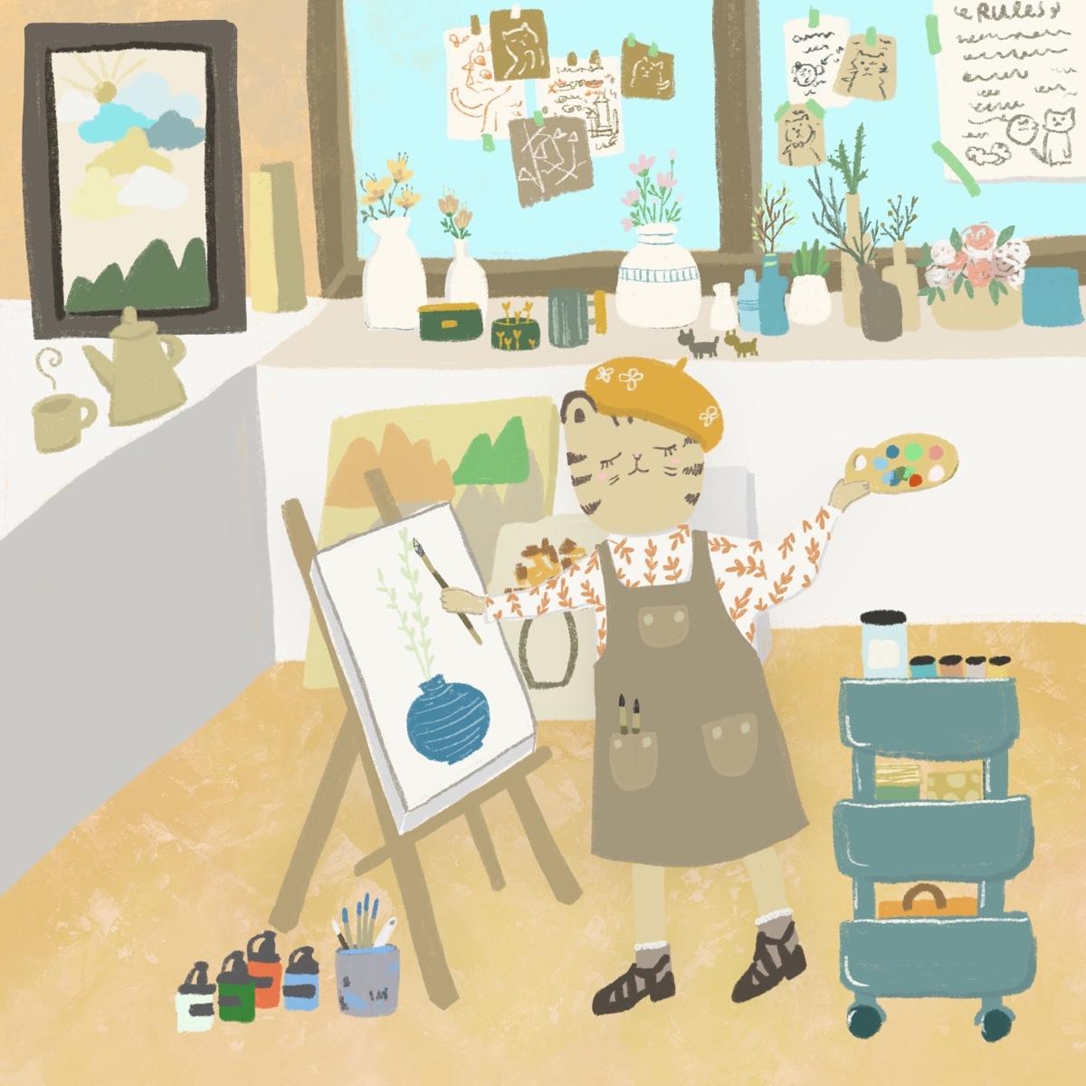 喵女士今天來到畫室練習畫圖,今天的主題是盆栽