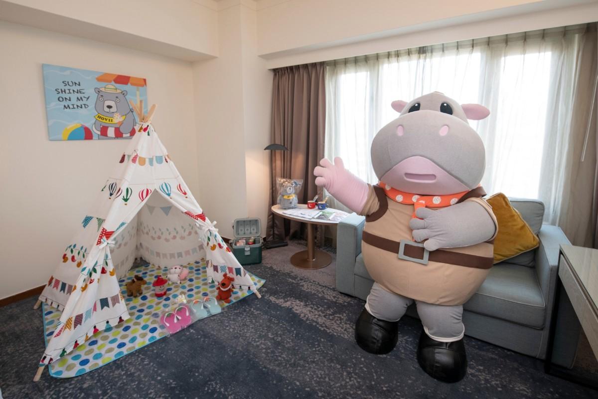 ▲客房內設置兒童遊戲小帳篷,提供玩偶、HOVII熊圖畫紙讓寶貝輕鬆放電(新竹福華提供)