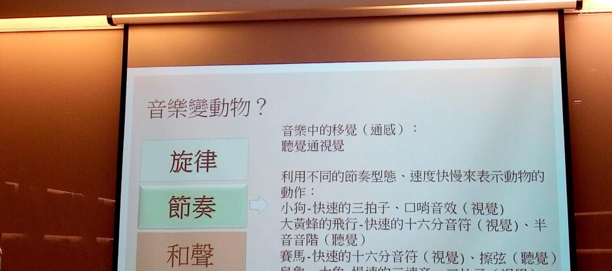 講座當然也有包括一些較學術性的知識抑或者是常識;如音樂中的三大元素包含了旋律、節奏、和聲,以及各元素細項的說明。然而,為了使音樂更平易近人,珮瑜老師在簡報中大量插入各式音樂,透過音樂本身刺激聽眾的聽覺,進而帶來心覺。