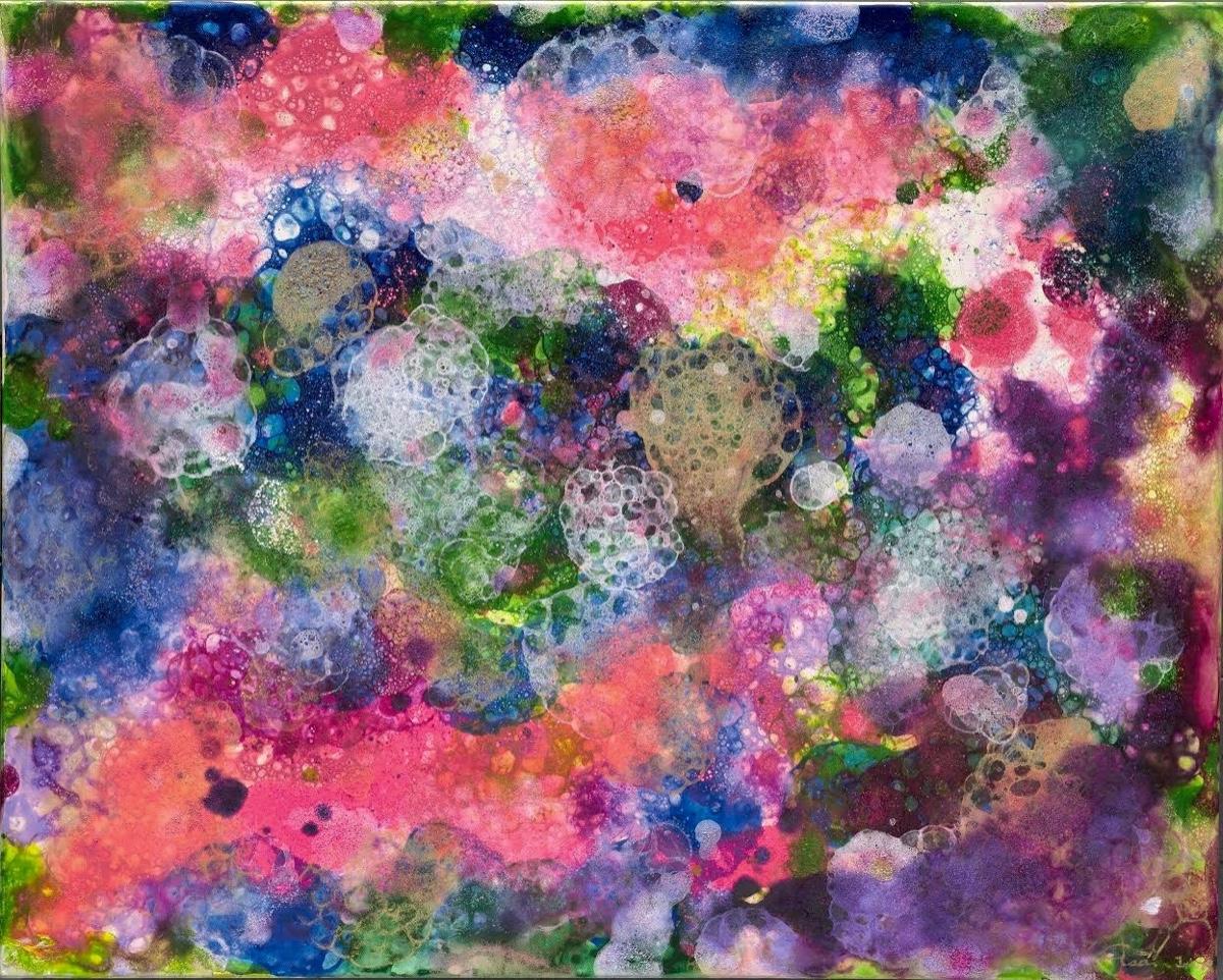 睡不著的那個夜晚,我閉上雙眼試圖幻想泡的繪製過程。突如其來的,在眼前呈現出了這樣的畫面。接下來,就是36小時不停歇的作畫過程,半夜醒來上廁所的老哥,嘆了一聲揚長而去:又在發神經了~之所以會有這樣的反應,是因為這幅作品是在 2 台除濕機 + 4 台鹵素電暖爐在下面烘烤,用不同濃度的壓克力顏料潑灑,與溫度產生的化學變化。畫面上清晰可見大小不一的各種泡沫,敘述的,正是地球暖化以及塑膠微粒。