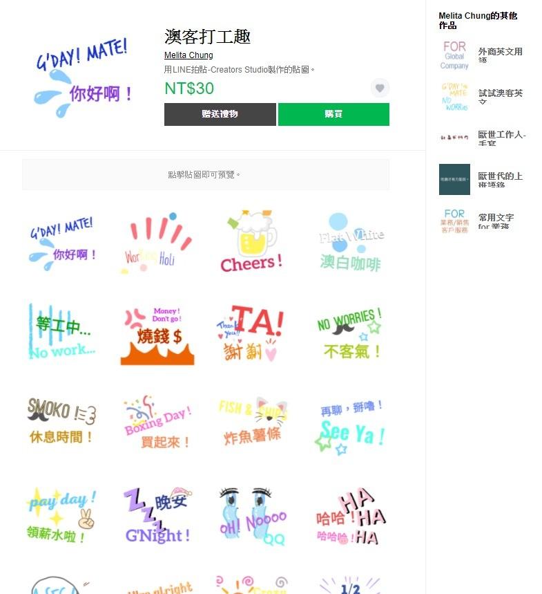 待業期間我突然太無聊,就用 Line Studio 做了一組貼圖《澳客打工趣》,但是很白癡一直沒有上架它,不過其實用 Studio 做的貼圖,創作者不能營利,所以其實也就還好,後來終於上架它了!