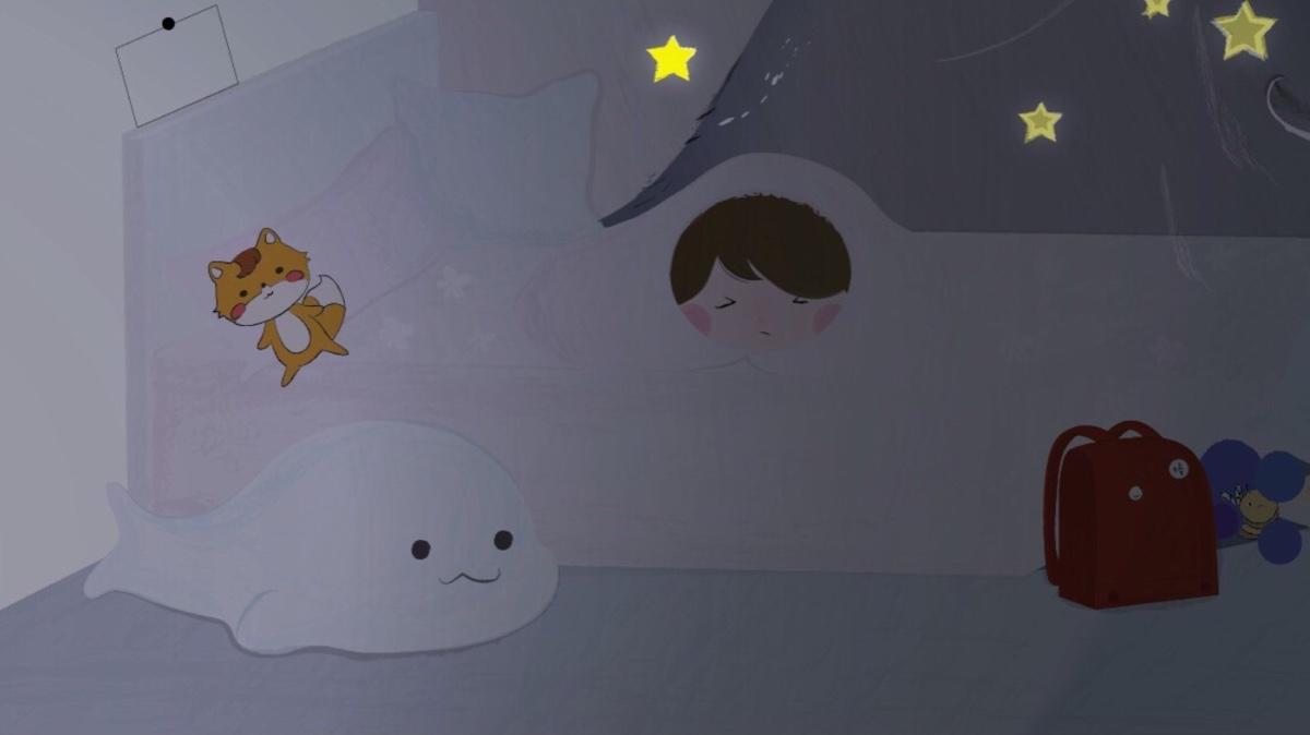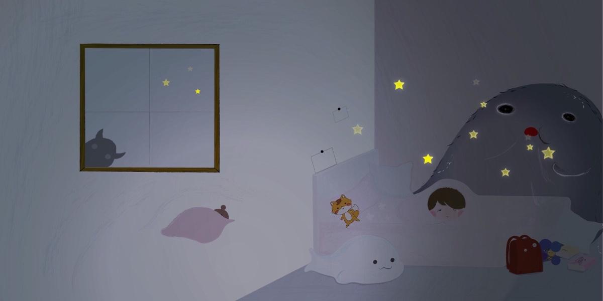 小女孩躲在棉被裡瑟瑟發抖著,是誰是誰,是誰躲在黑暗裡,一閃一閃的星星去哪了。