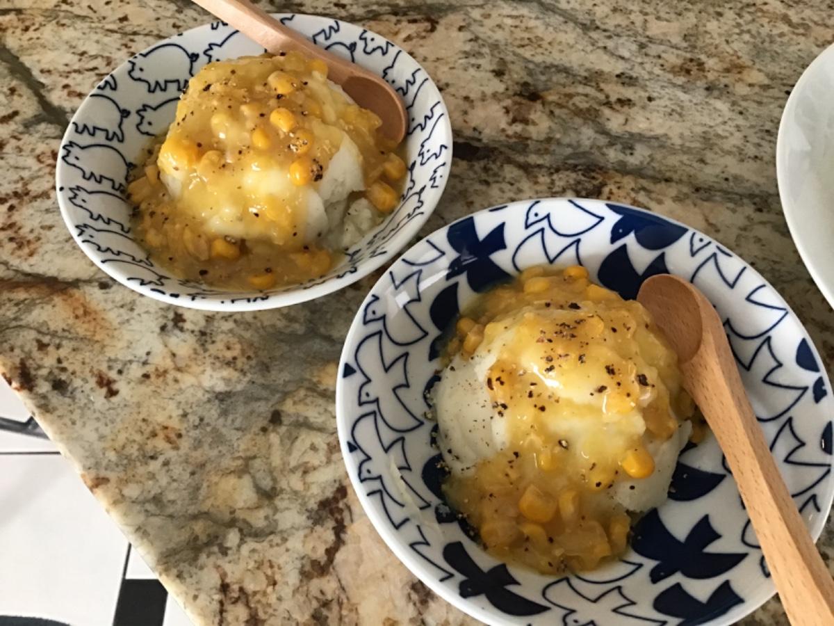 我淋了玉米上去,這個玉米呢,也是現成品罐頭😆這裡的玉米罐頭有好多口味,純玉米粒、玉米加毛豆還有這種玉米糊(corn cream)我滿喜歡這個玉米糊的,好好吃喔~跟沖泡薯泥非常搭,薯泥偏鹹、玉米甜甜的,互相中和變成很溫和可人的味道!而且現成品好爽喔,好輕鬆⋯遙想當年搗馬鈴薯的日子⋯⋯也不知道有沒有比較好吃⋯⋯
