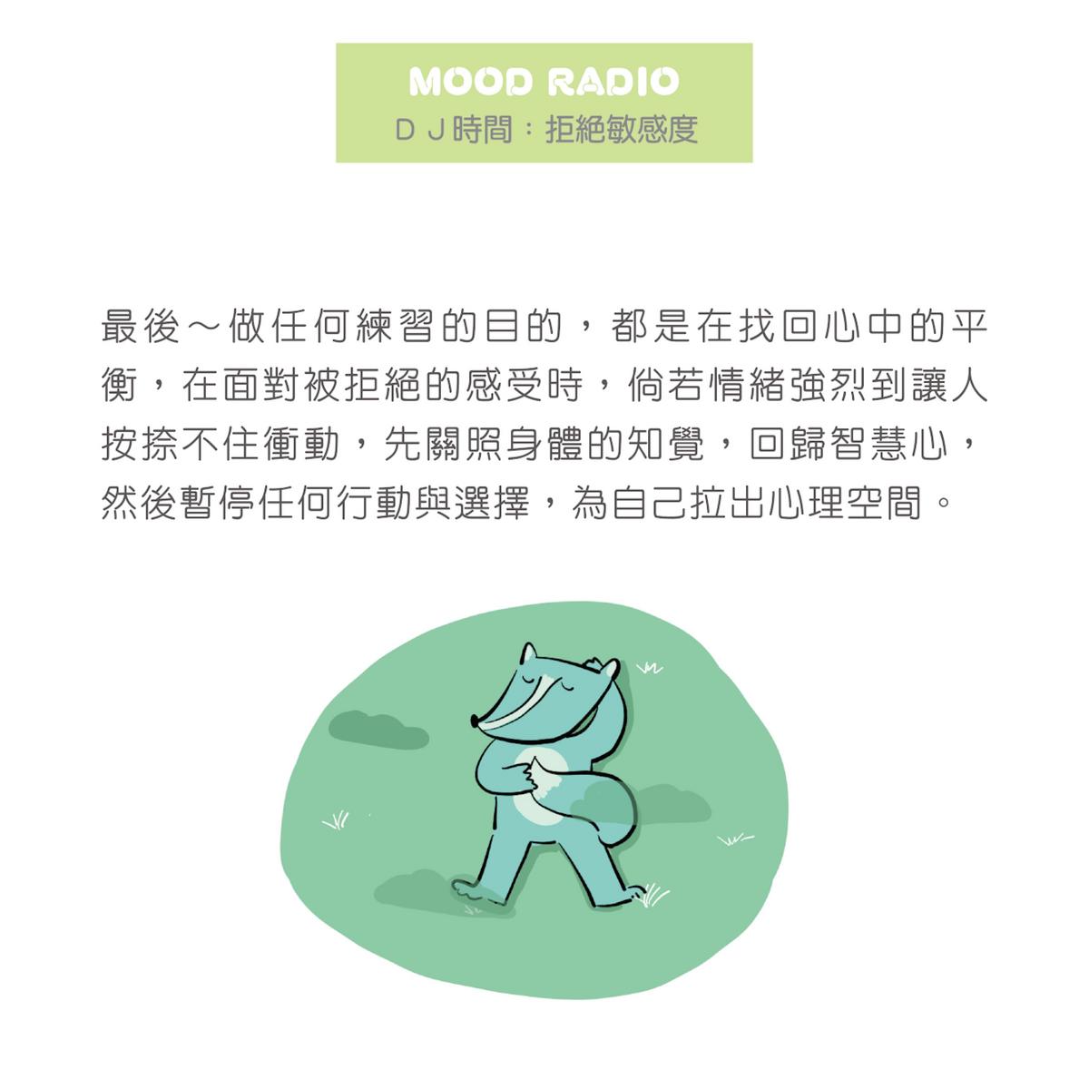 透過正念的練習,幫助我們先與事件情節拉出距離,專注在身體的感受,照顧好自己的感官知覺後,情節中的「事實」也會逐漸明朗,不至於讓我們繼續深陷被拒絕的情境裡。
