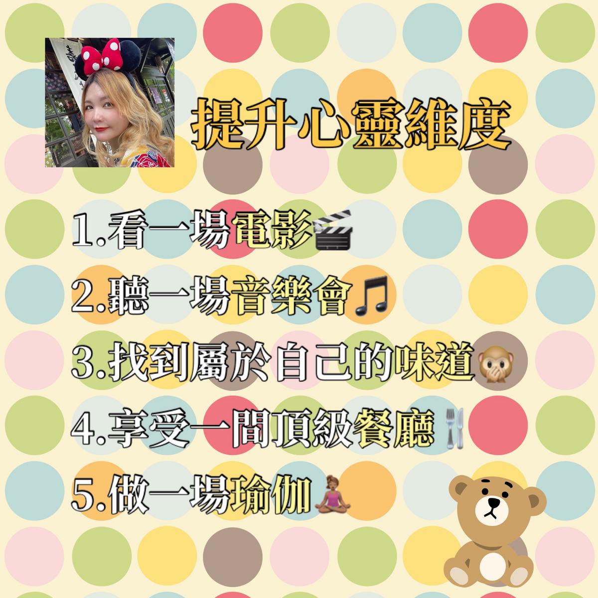 如何提升心靈維度 ——— 1.看一場電影或運動比賽 2.聽一場音樂會或歌劇 3.尋找屬於自己的味道,如果你不喜歡香水、可找找室內香薰、精油或者洗沐產品 4.享受一頓豐盛的大餐吧!盛裝打扮前往你很想踏進的那間餐廳,享受食物帶給你的美好吧! 5.做個瑜伽!多久沒有伸展自己的肌肉?在伸展的過程中正視自己的內心吧! #心靈 #正能量