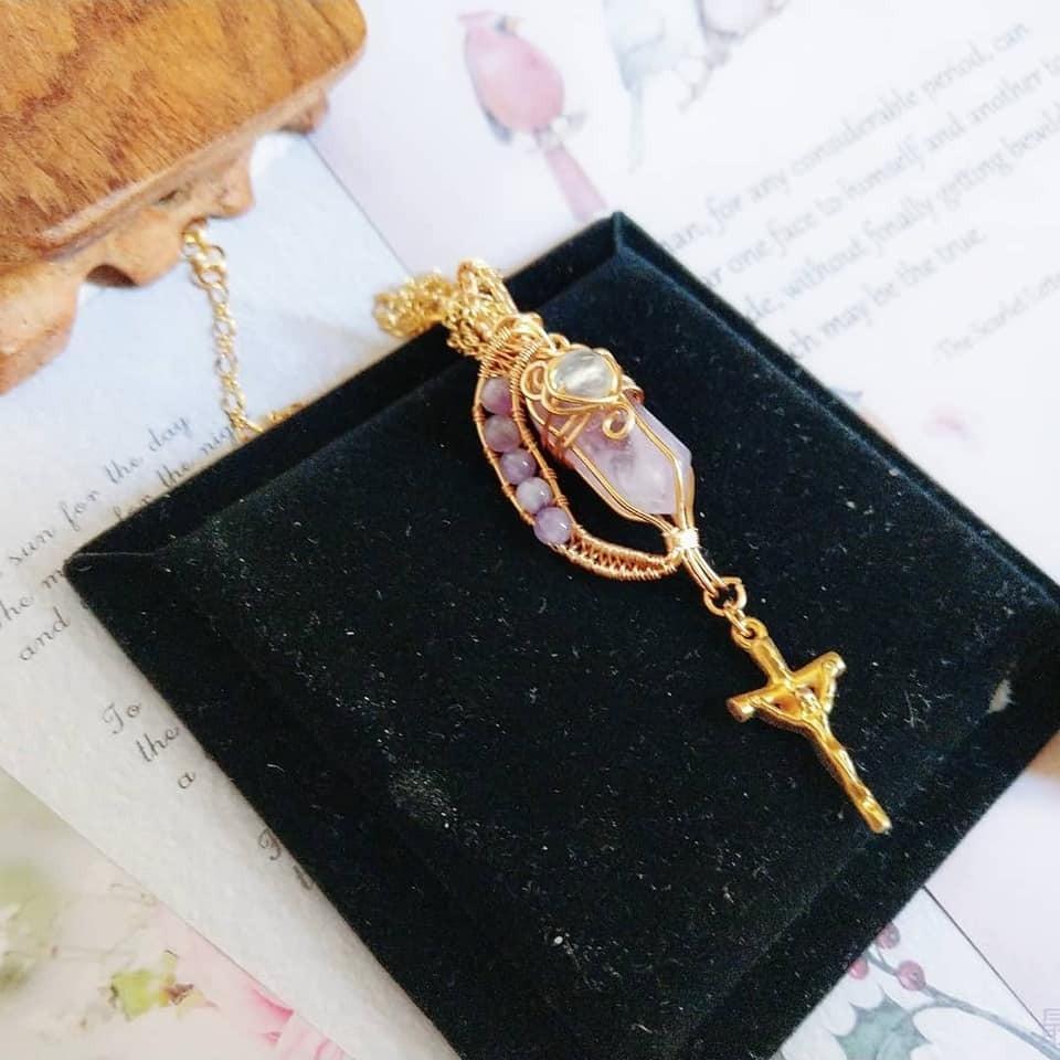 使用材料:紫水晶柱、紫水晶珠、螢石、金色藝術銅線、合金十字裝飾、合金鍊子45公分+3公分左右的延長鍊、龍蝦扣