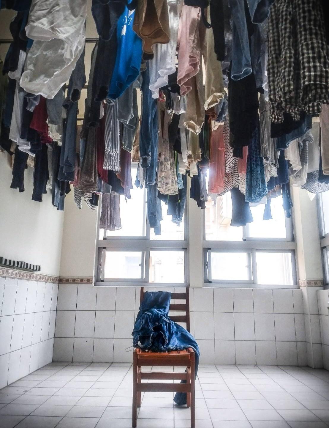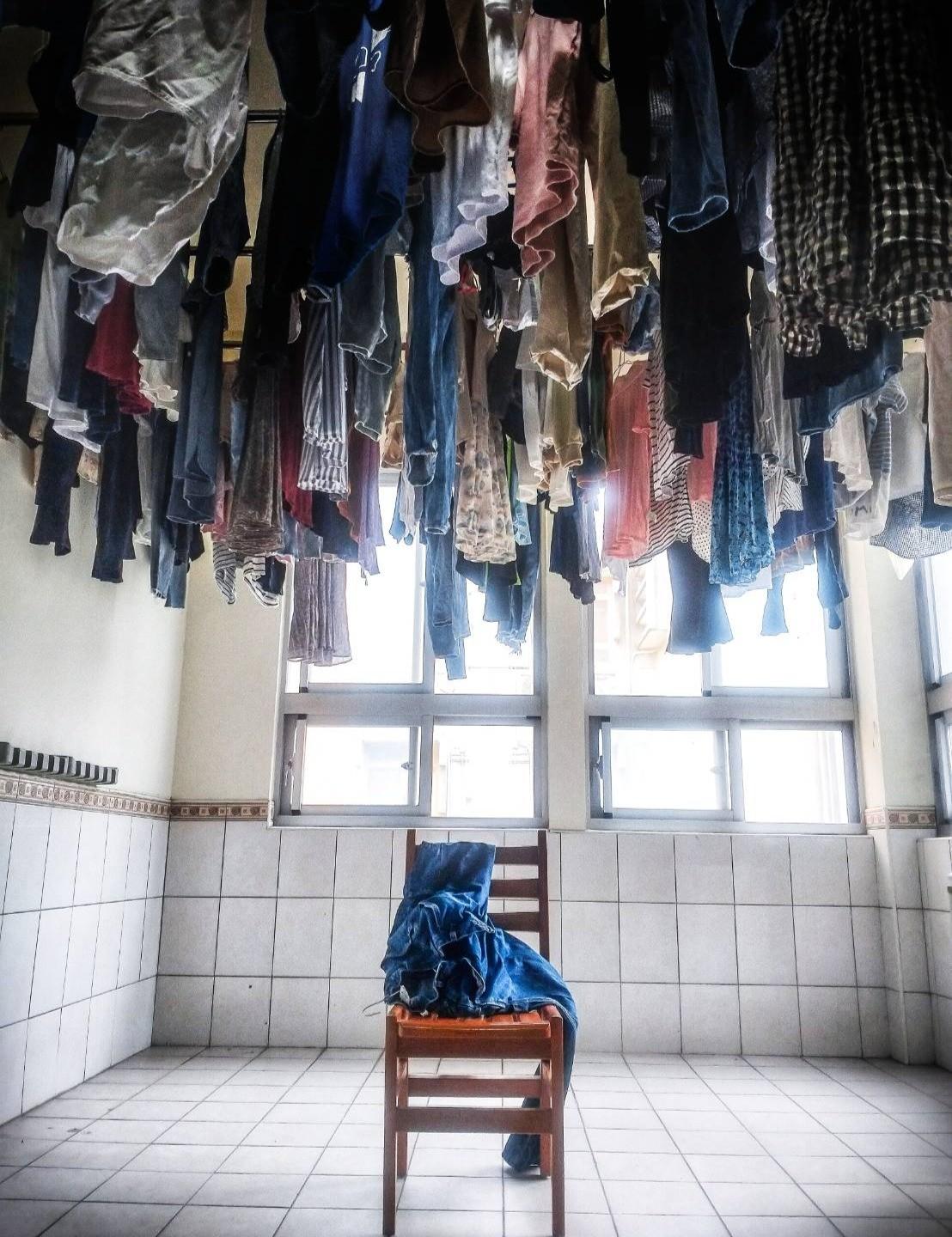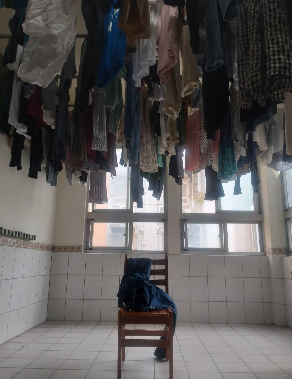 故事大意是這樣的,我一早起來決定去宿舍的洗衣間洗衣服,發現擺在洗衣間的椅子在晨光下有點藝術,可能是因為它的頭頂有一堆衣服(宿舍都這樣)在加上白色磁磚在陽光下顯得非常明亮對比之下的緣故。
