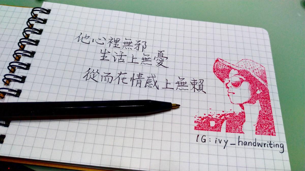 他心裡無邪,生活上無憂,從而在情感上無賴 1 / 1文:陳濟舟《永發街事》筆:skb202(小黑大叔聯名款)#手寫#HandWriting#字來水小姐#MRS轟的寫字房IG: @ivy_handwriting (字來水小姐♡Ivy) 字來水小姐 ♡ Ivy喜歡寫字,偶爾會到山裡玩水的女子