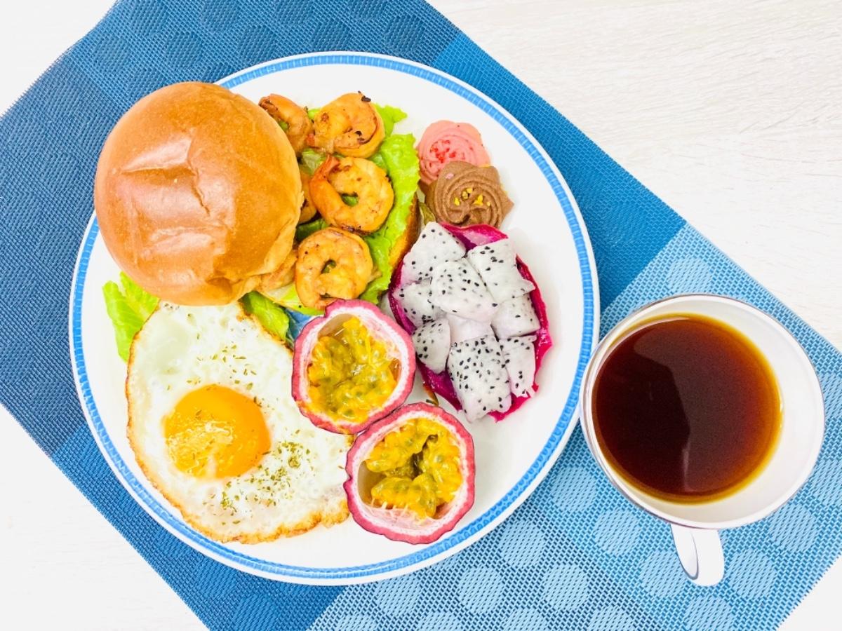 主食:醬燒鮮蝦太陽蛋生菜🥬花生醬漢堡