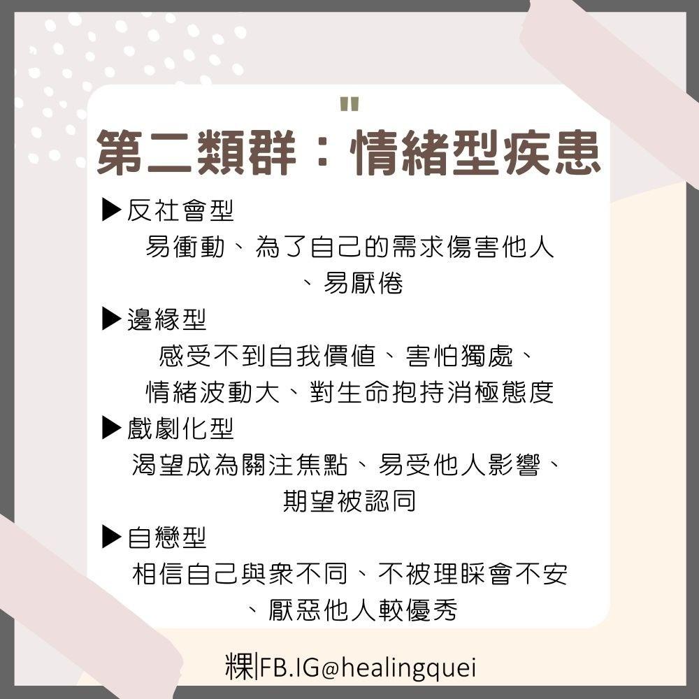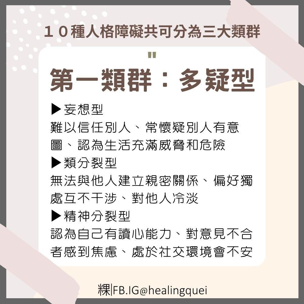 由美國精神醫學會《精神疾患診斷及統計手冊》所記載的人格障礙,共有三大類群、10種類型,像是依賴型、邊緣型、逃避型、反社會型…等等。
