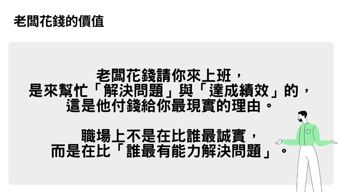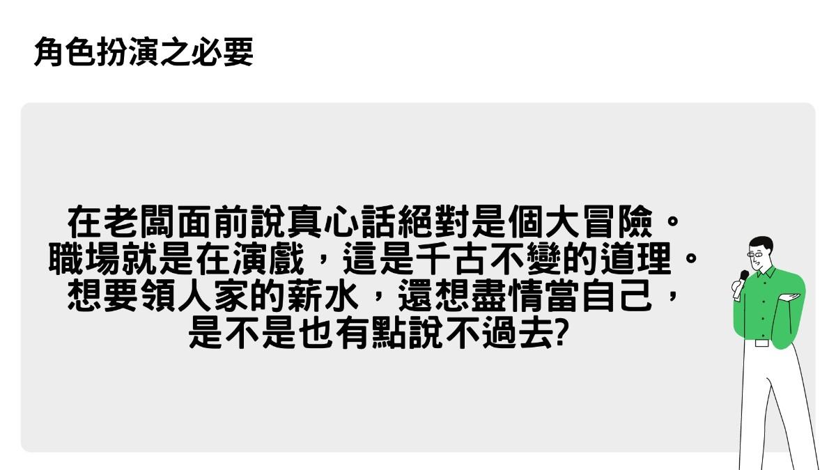 出社會後,與朋友聚會聊天的內容不再只是週末去哪玩、哪個化妝品最近有在促銷,更多的是抱怨主管機車、說討人厭同事的不是。我明白身而為人難免都有情緒,但職場這回事說穿了根本沒有所謂「規則」可言,公司的鐵律比不上老闆的「聖旨」,你與主管間的關係如同歷史課本上記載的九二共識,大部分的時間都各自表述,而「共識」只是為了維繫表面和與符合社會期待下所誕生的產物。