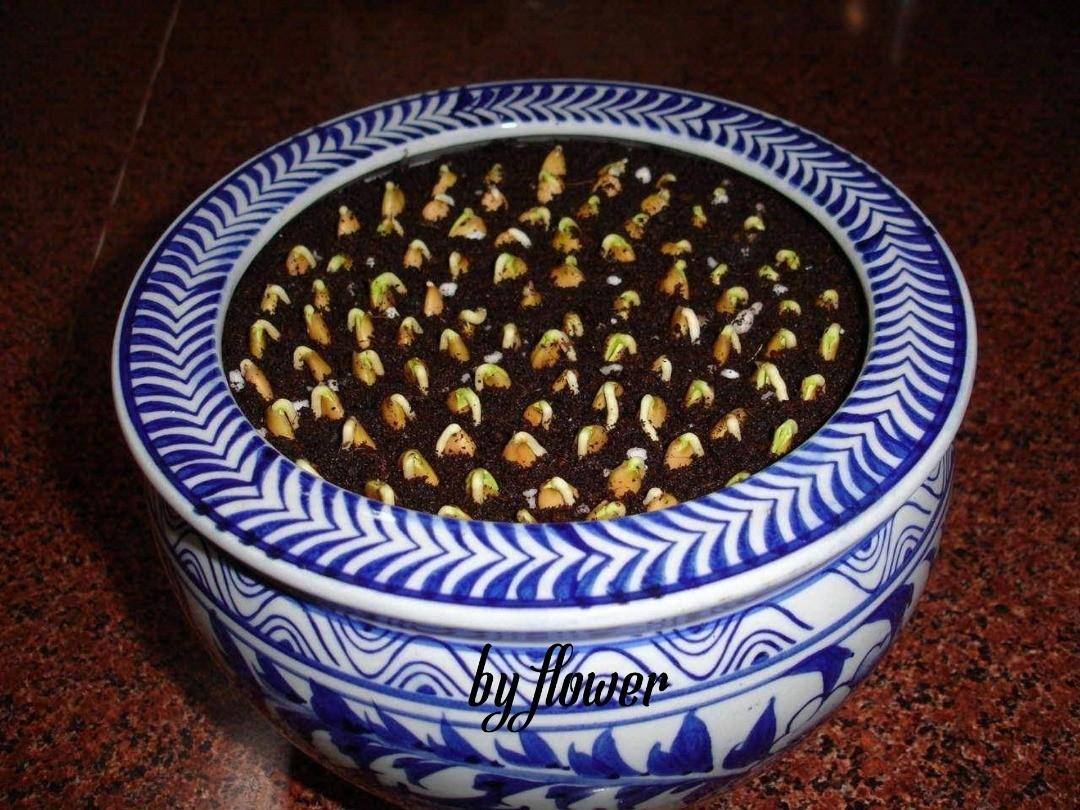 二: 種籽浸泡大約十天後準備栽種,將種籽的外皮剝除,尖頭朝上,栽植時可依自己喜好的圖形栽種,範例是同心圓圖形.