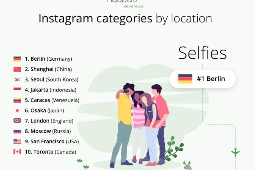 9.自拍找都標記哪些地點, 冠軍是柏林、亞軍上海、季軍首爾。柏林好意外,德國人有這麼愛自拍?我還以為他們很務實耶,中國人和韓國人本來就超愛美,不意外~~