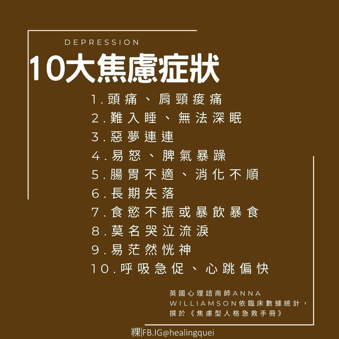 (以上10點症狀由英國心理諮商師Anna Williamson依臨床數據統計,撰於《焦慮型人格急救手冊》)