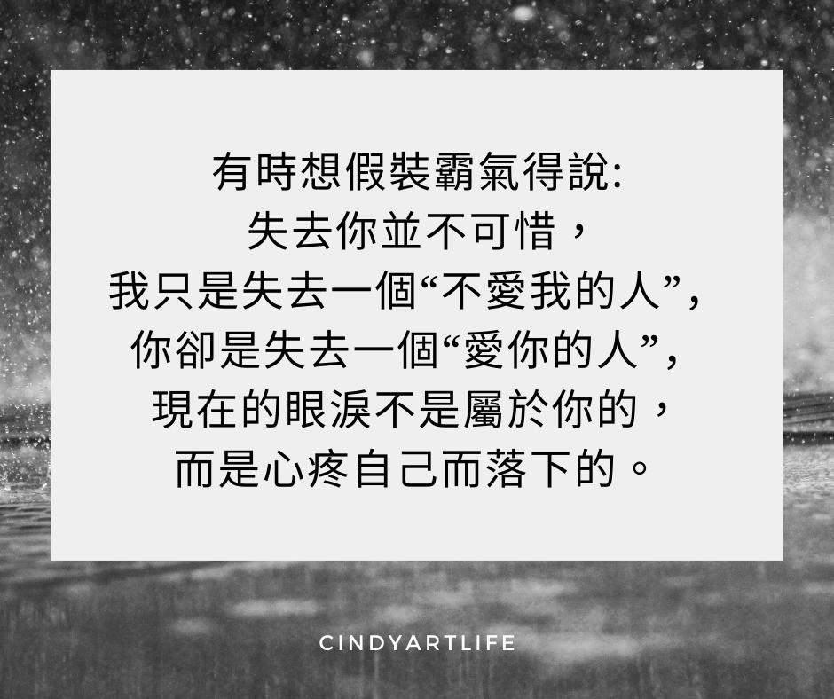 分手後...... 1 / 1有時想假裝霸氣得說: 失去你並不可惜,我只是失去一個“不愛我的人”,你卻是失去一個“愛你的人”,現在的眼淚不是屬於你的,而是心疼自己而落下的。 #分手#情傷#失戀#療傷#心情 Cindy喜歡畫畫、美食美景、瑜珈、鋼琴及投資理財
