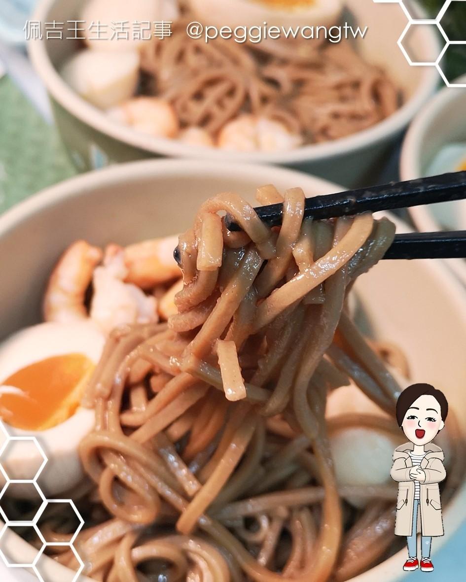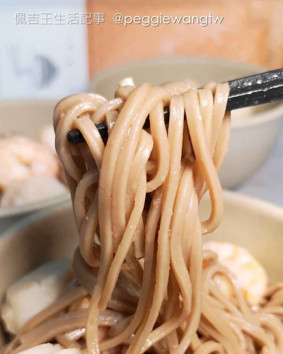 不二堂 X Walkerland 茶拌麵,有蔥爆、椒麻兩口味,每包$135/麵體100克*2入、醬30克*2入。成分表都在外包裝上,很清楚。每包就是兩束麵和兩包醬,麵體成分包含小麥粉、水、南投炭焙烏龍茶粉、食鹽。我家這餐除了麵之外,配上全家媽媽煮藝溫泉蛋、天和鮮物草蝦仁、安永鮮物大干貝,還有炒青菜。