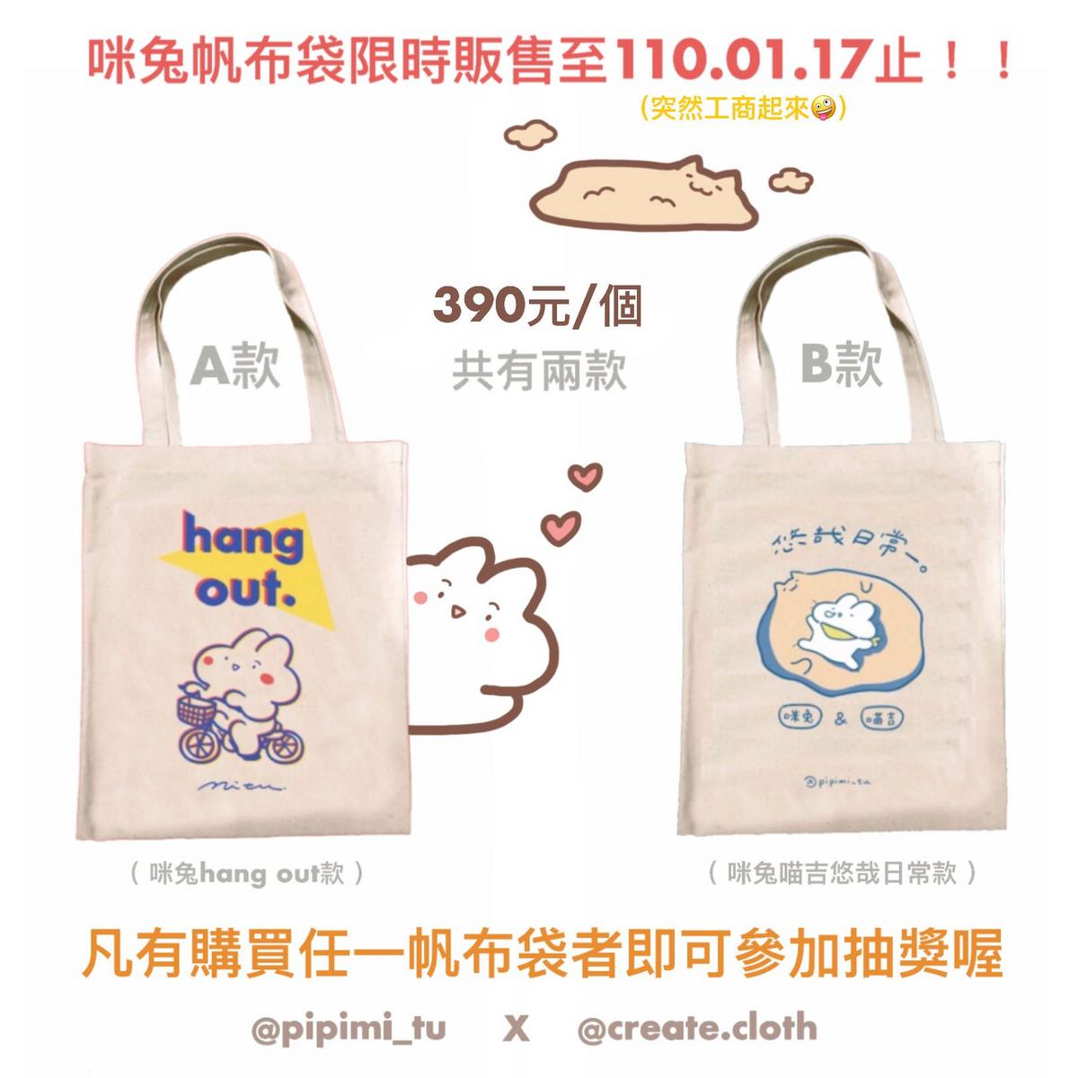 📣咪兔帆布袋限時販售至110.01.17止喔!🔥售價390元/個,抽獎辦法及購買資訊請參考以下: