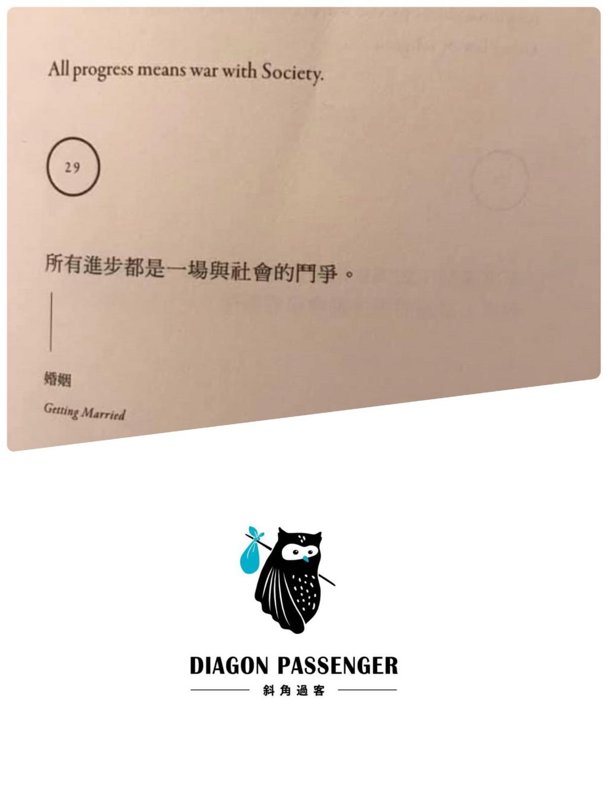 蕭伯納的句子是:「所有的進步都是一場與社會的鬥爭。」他談的是「對立」。