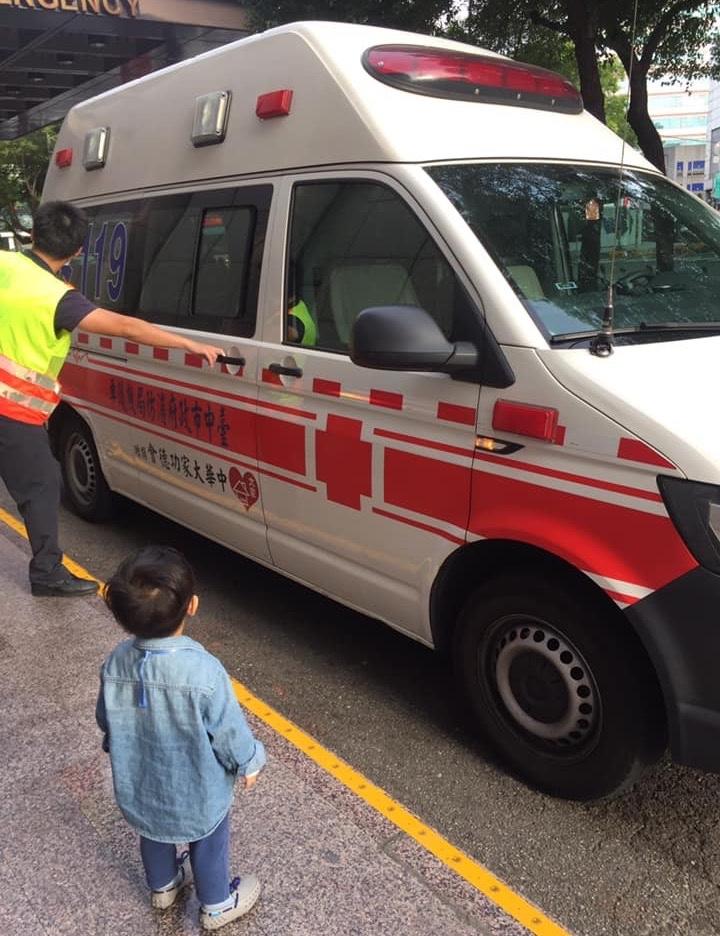 今天陪先生去醫院一趟幫婆婆拿藥,為避免兒子在醫院裡暴走,我步步驚心的引誘他到外面,邊滿口夾帶著謊言說:「你等一下,再等一下,等等救護車就會歐一歐一來了。」邊冷卻他隨時想爆衝的腳勤,幸好不到三分鐘來了兩台,不然媽媽很難找台階下。不過說也奇怪,自從展開”車車戶外教學之旅”後(其實也才兩趟),我和兒子就像個”笑杯”一樣,當我們鬼鬼祟祟又興奮難耐的徘徊在車子週邊時,工作人員與路人,但凡看到我們母子都覺得促咪,便前來搭話幾句「弟弟,來看XX車噢~~」(台語:愛笑)並試圖開箱車內部讓我們參觀。說真的,我當下都很想跟他們分享我的心路歷程與苦衷..